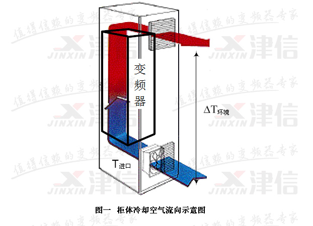 變頻器一般通過(guò)變頻器內(nèi)置的風(fēng)扇來(lái)散熱,如果變頻器安排在柜體內(nèi),這會(huì)導(dǎo)致柜體溫度升高。雖然柜體的柜壁也有一定的散熱能力,但是由于柜體的柜壁散熱能力小于50W,在計(jì)算中,這部分散熱可以忽略不計(jì),所以還需要采取其他外部措施來(lái)散熱。最典型的散熱方式是在柜門或柜壁上安裝風(fēng)扇,如圖一所示。