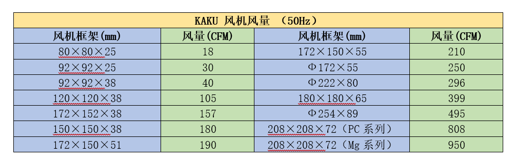 下表列出市場(chǎng)上比較常見(jiàn)的卡固(KAKU)風(fēng)機(jī)的數(shù)據(jù),作為我們上面例子的風(fēng)機(jī)選型參考。