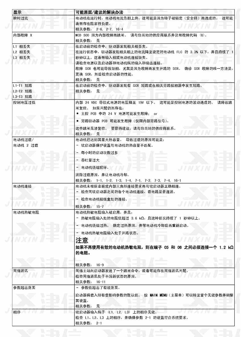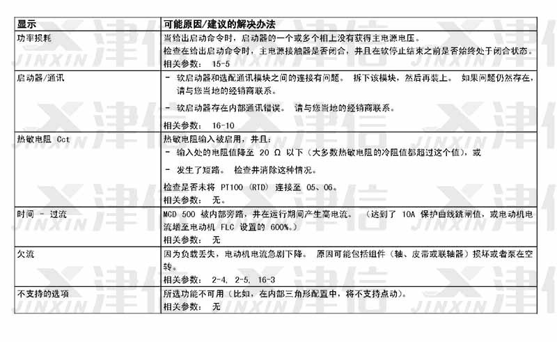 在軟啟動(dòng)器使用過程中,如果偵測到故障信息,軟啟動(dòng)器會(huì)在日志中記錄相關(guān)信息,還可能跳閘或發(fā)出警告。軟啟動(dòng)器跳閘后,只有將該軟啟動(dòng)器復(fù)位才能重新啟動(dòng)。 如果發(fā)出警告,則一旦消除了警告原因,軟啟動(dòng)器便會(huì)自動(dòng)復(fù)位。