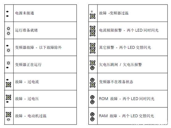 西門子變頻器的上,下兩個ALM指示燈有四種狀態(tài),分別是燈滅,長亮,快速閃爍,和閃爍,分別代下以下含義: