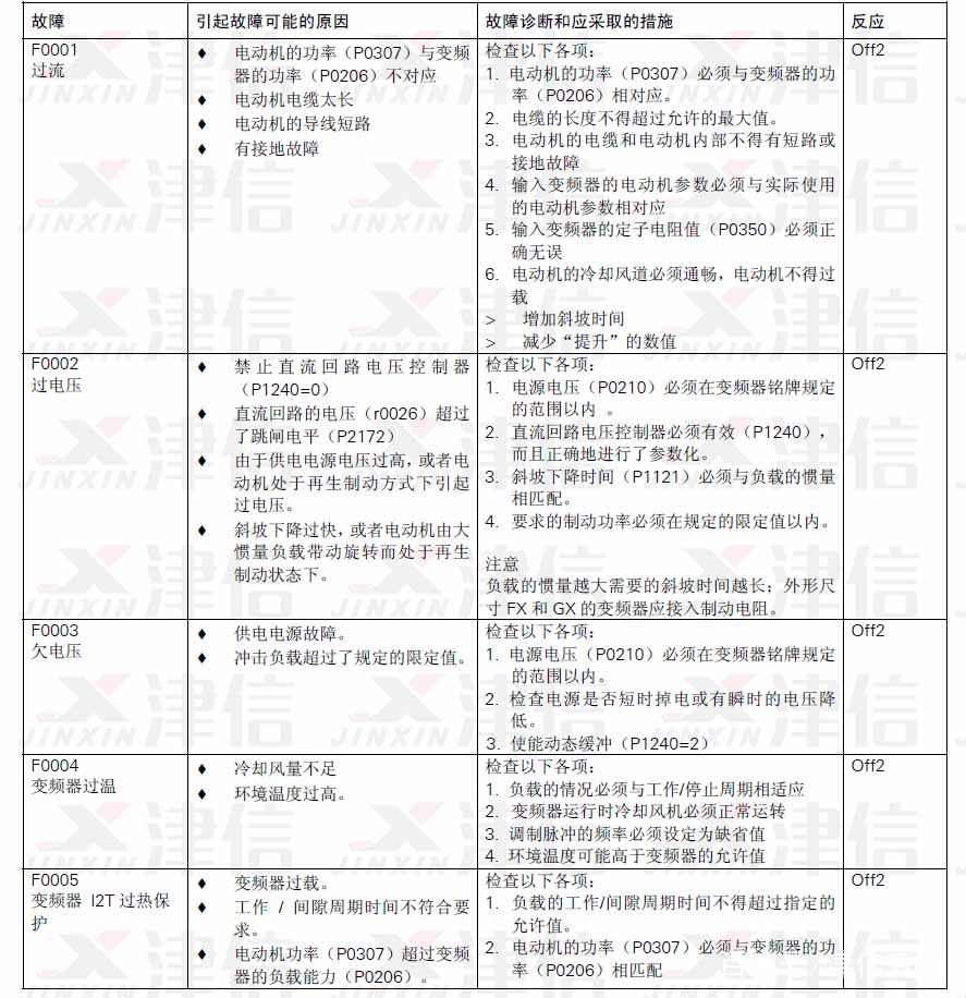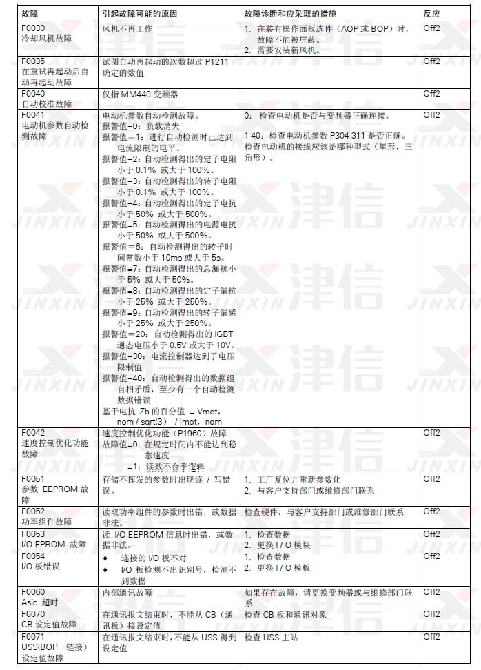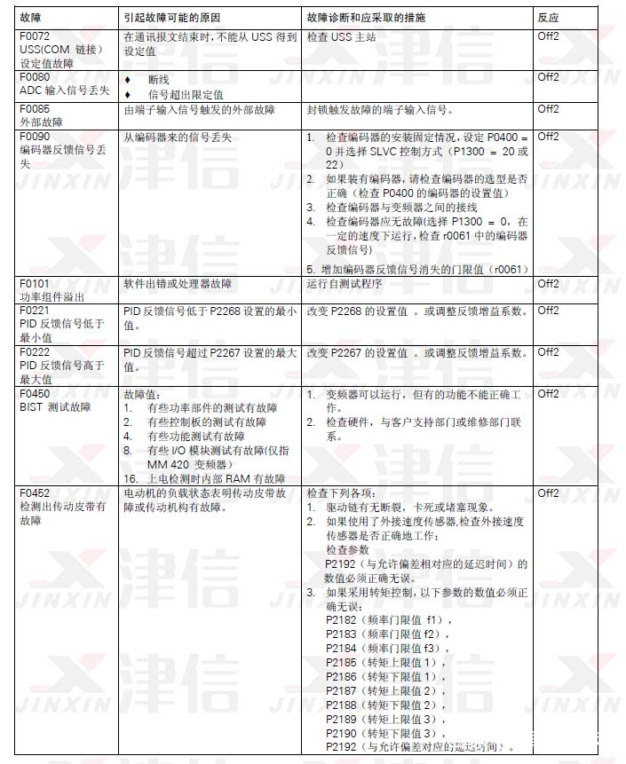 故障信息以故障碼序號的形式存放在參數(shù)R0947 中(例如,F(xiàn)0003=3)。相關的故障值可以在參數(shù)R0949 中查到,如果該故障沒有相關的故障值,R0949 中將輸入0。而且,可以讀出故障發(fā)生的時間(R0948)和存放在參數(shù)R0947 中的故障信息序號(P0952)。