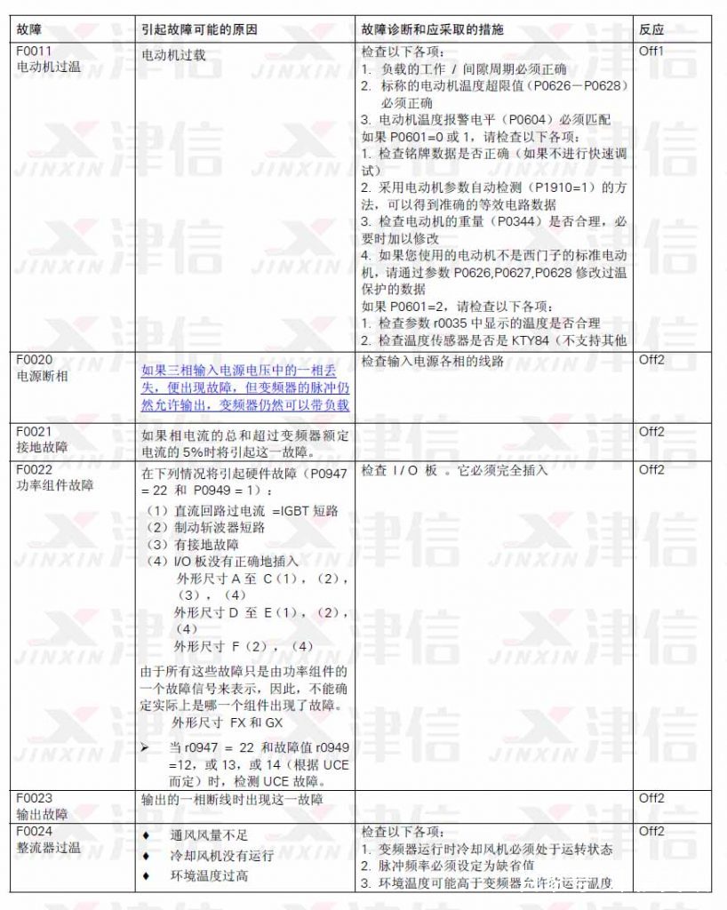 二、F0011電動機過溫,F(xiàn)0020電源斷相,F(xiàn)0021接地故障,F(xiàn)0022功率組件故障,F(xiàn)0023輸出故障,F(xiàn)0024整流器過溫