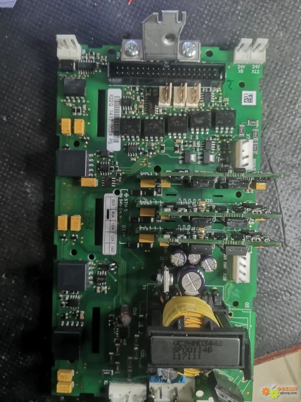 690V的驅(qū)動(dòng)板首先修好電源,才發(fā)現(xiàn)次級(jí)驅(qū)動(dòng)變壓器全部掛了,二次電源修復(fù)正常以后,上電馬上就跳出一個(gè)f7的故障,這個(gè)故障的意思是,輸出飽和的意思。